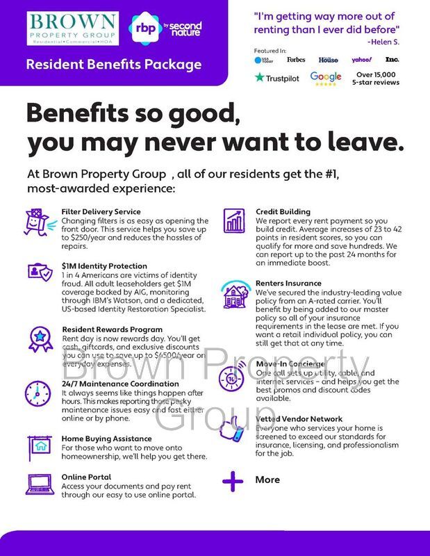 All Brown Property Group residents are enrolled in the Resident Benefits Package (RBP) for $40.95/month which includes renters insurance, credit building to help boost your credit score with timely rent payments, $1M Identity Protection, HVAC air filter delivery (for applicable properties), move-in concierge service making utility connection and home service setup a breeze during your move-in, our best-in-class resident rewards program, and much more! More details upon application. Resident is also responsible for a $10/month technology fee and a one time $100 leasing fee due prior to lease signing.